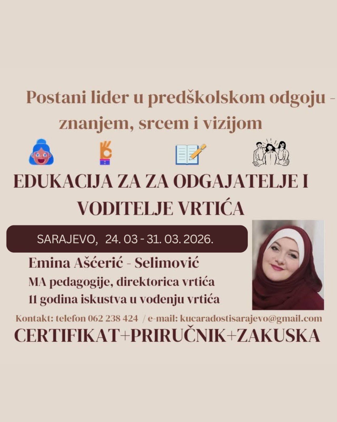 🎓 Učesnici dobijaju: Certifikat | 📖 Priručnik | 🍽 Zakusku (na dan uručivanja certifikata)