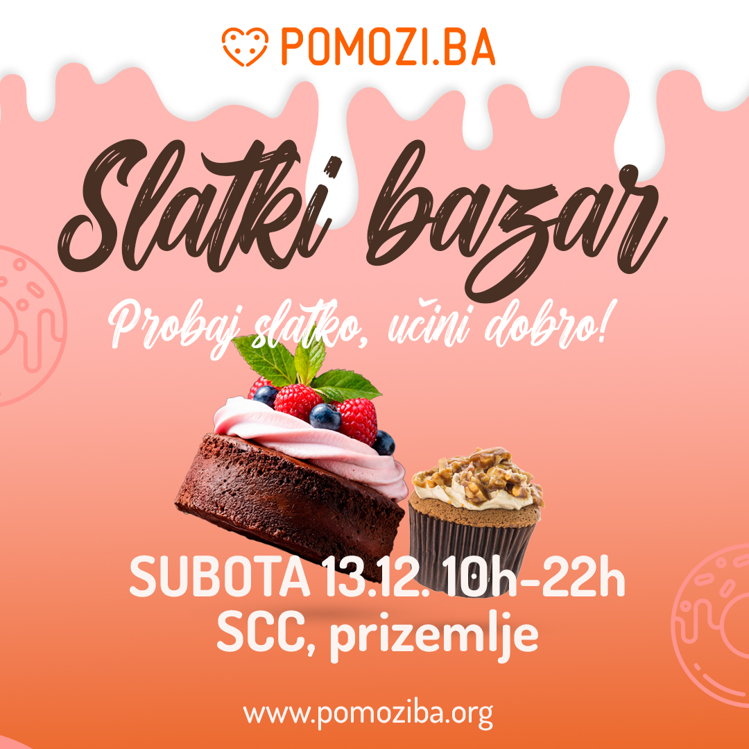 Udruženje Pomozi.ba u subotu, 13. decembra, organizuje Slatki bazar, s ciljem prikupljanja sredstava za projekat "Obrok za sve". Taj projekat omogućava svakodnevno oko 1.000 obroka za osobe u potrebi.